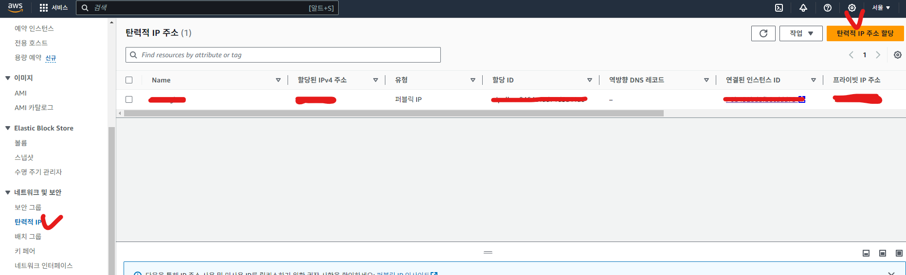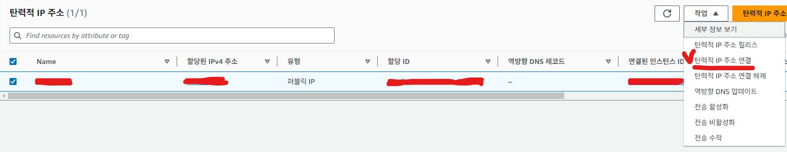 > 할당 클릭하면 탄력적 IP 생성되고 아까 만든 인스턴스와 탄력적 IP를 연결해야함.