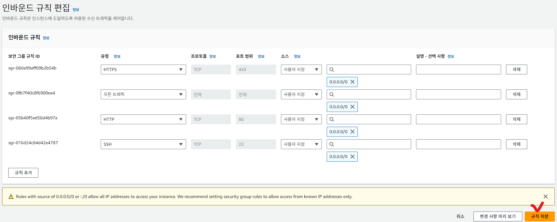 > 모든트래픽 : 모든 인바운드 허용하는 것 (이걸 해도 보안이 조금 취약해지지만 접속이 된다 하더라도 관리자나 서버접속은 또 0이후에 권한 인증으로 접속을 해야되기 때문에 모든 트래픽으로 해도 처음엔 상관없음)