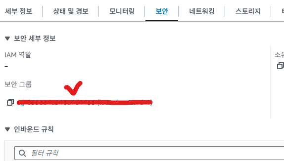 > 인스턴스 선택 후 아래 보안 탭으로 이동