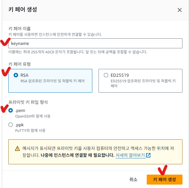 > 이름 입력하고, 아래와 같이 설정 후 키 페어 생성