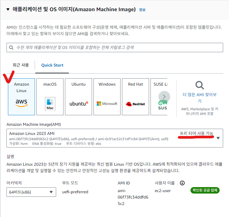 : Amazon Linux 2023 / 계정 생성 후 1년 동안 프리티어 사용 가