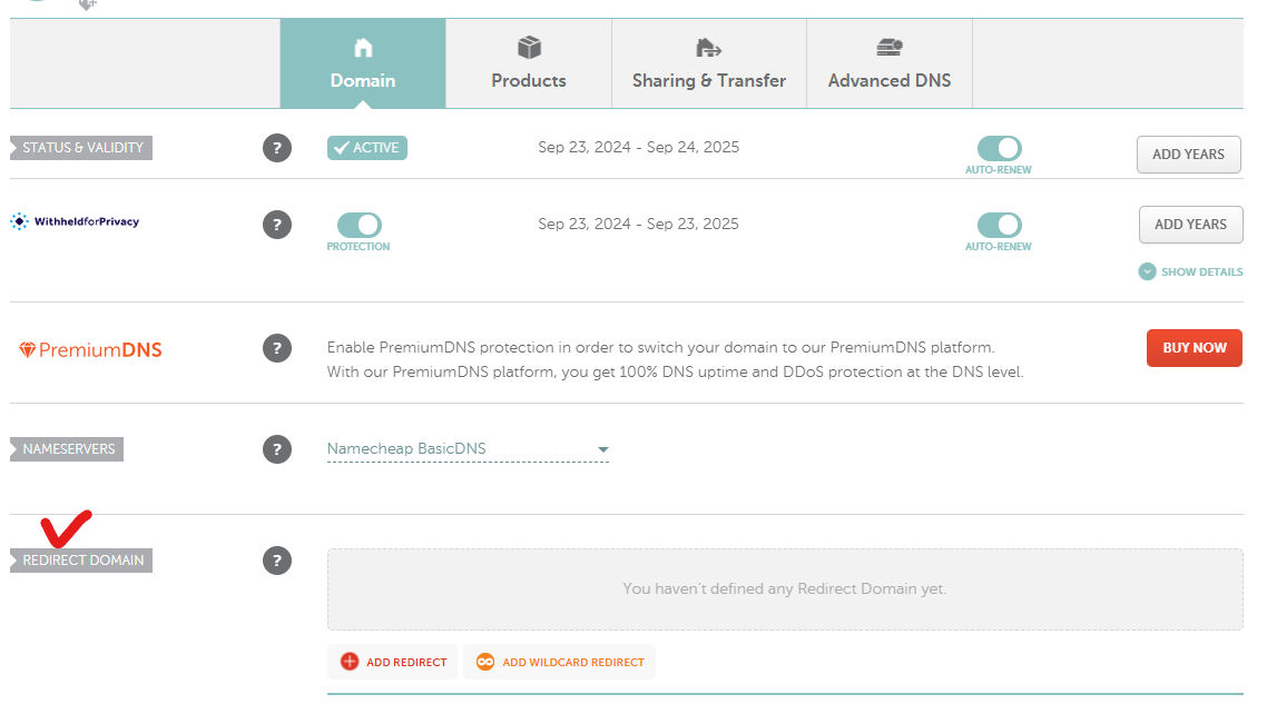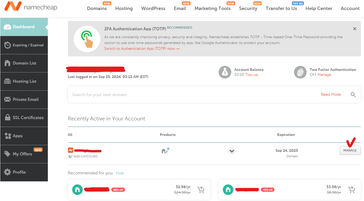 > namecheap에서 내가 구매한 도메인 manage로 들어감