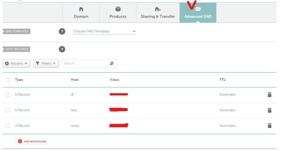 > Advanced DNS 탭으로 넘어가 Host recoreds에 원래 있던 것 모두 삭제한 후 아래와 같이 추가